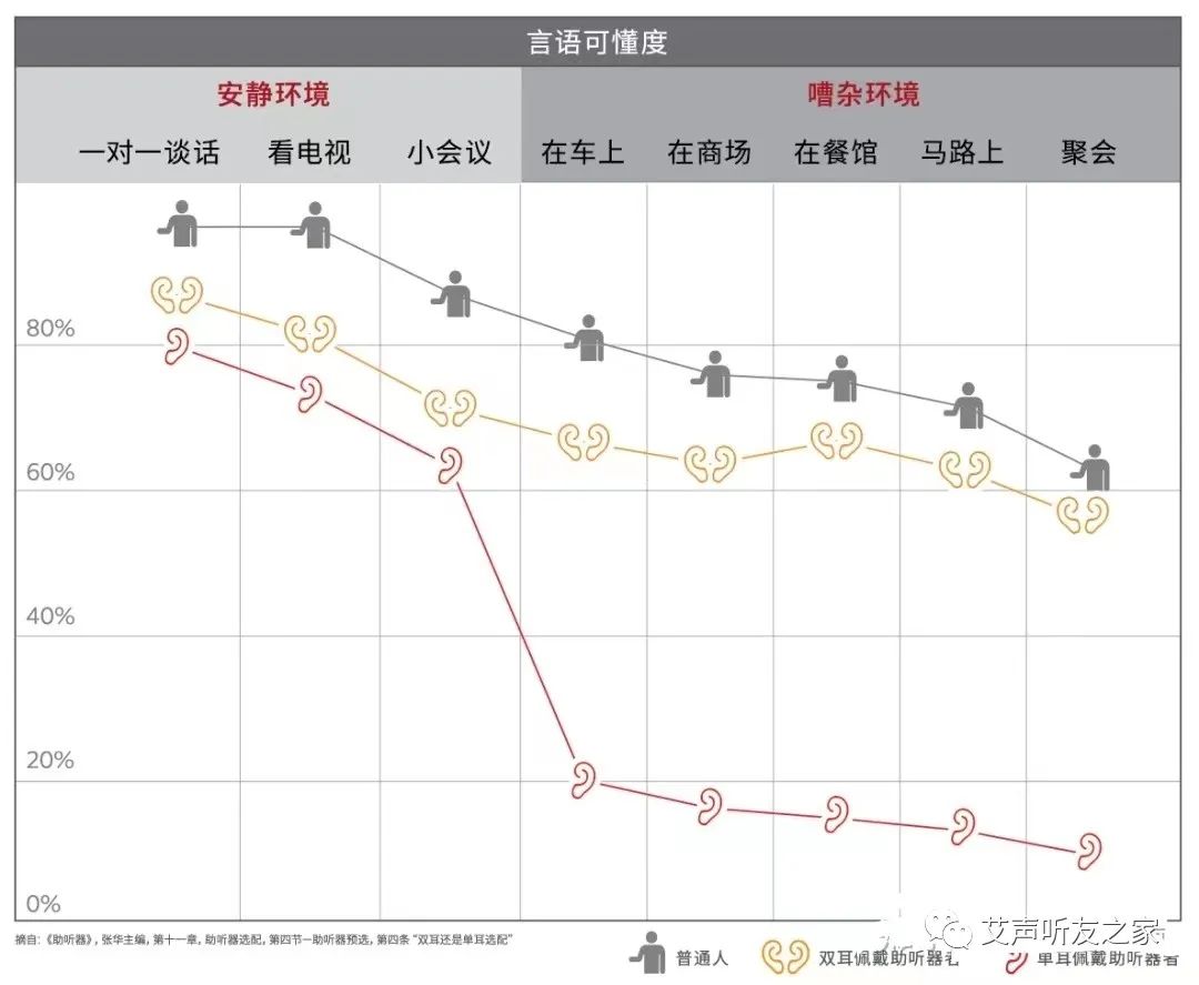由于耳朵在頭顱的兩側,當聲音從左側發出時,頭顱影響了聲音的傳播,左耳聽到的聲音要明顯比右耳大,這一現象為頭影效應。當雙耳都有聽力損失時,只給右耳配戴助聽器,雖然聲音從左側發出,但會誤以為聲音在右邊。雙耳選配有助于消除頭影效應,避免言語信息到達另一耳時的衰減造成語言可懂度下降。
