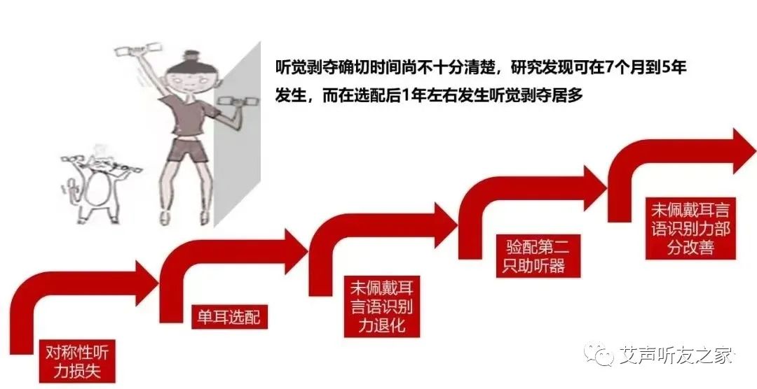 產生聽覺剝奪效應的主要原因是因為戴助聽器的耳朵向大腦輸送了足夠的信息,使得大腦不再去關注沒有佩戴助聽器的耳朵,大腦似乎放棄了對傳送較弱信號耳的關注。雙耳選配可以避免聽覺剝奪現象,使兩耳的言語分辨率保持穩定。