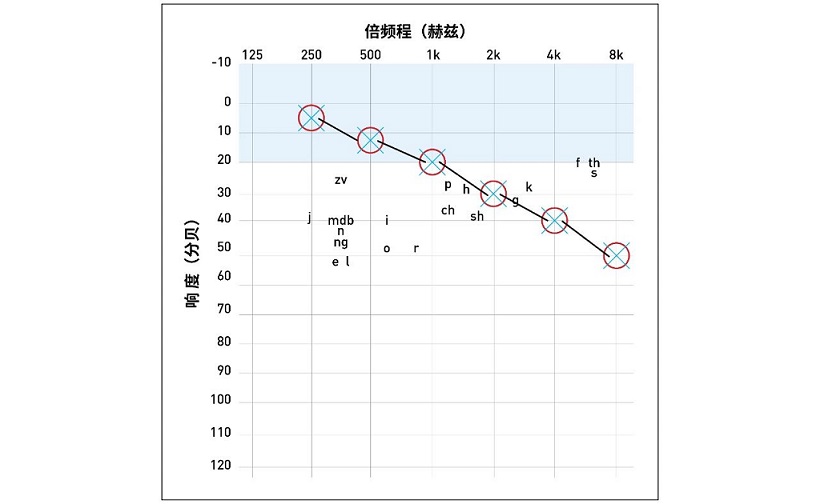 言語香蕉圖內的字母表示由于聽力損失,受試者可能難以聽到的言語聲。