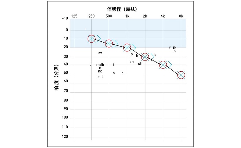 各種字母(例如p、ch、sh、e、i等):他們并不是聽力評估的結果(也不是每個聽力圖都會出現),而是聽力專家在測試完成后使用的輔助工具,叫做言語香蕉圖。人類的言語聲,也是經由空氣傳播的一種聲音。因此針對正常音量下的語音,也有其相應的頻率和強度,也可以用這幅圖表來描述。比如,/m/聲頻率低而/sh/聲頻率較高。而通過科學的檢測發現,這些語音在聽力圖上的分布形態,好像一只香蕉,言語香蕉圖也因此得名。簡單來說,言語香蕉圖可以幫助專業人士判斷測試者不僅“聽得見”,還能夠區分不同頻率和強度的言語聲,來判斷測試者是否“聽得清”。