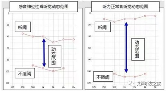范圍變窄了,以下圖為例。上邊的陰影部分,代表聽(tīng)不到的聲音范圍,下邊的陰影部分是會(huì)感覺(jué)不舒服的聲音范圍,中間空白部分就聽(tīng)覺(jué)動(dòng)態(tài)范圍。聽(tīng)覺(jué)動(dòng)態(tài)范圍一般聽(tīng)力正常的人能夠聽(tīng)到的最小聲音在0分貝-25分貝之間,最大聲音可以忍受到120分貝。而聽(tīng)力受損的人能夠聽(tīng)到的最小聲音,可能在30分貝,60分貝,甚至80分貝,能夠忍受的最大聲音卻可能還沒(méi)有120分貝。所以聽(tīng)力下降的朋友,對(duì)大聲的忍受能力并沒(méi)有比普通人高。且常常是從聽(tīng)不見(jiàn)的安靜環(huán)境,突然到能聽(tīng)見(jiàn)的大聲環(huán)境,就像普通人從安靜的環(huán)境突然到嘈雜的車(chē)間,會(huì)覺(jué)得非常的吵,都是一樣的。另一方面,是因?yàn)橹卣瘢锹?tīng)力損失后的一種常見(jiàn)現(xiàn)象,多見(jiàn)于感音神經(jīng)性聾患者。對(duì)于正常聽(tīng)力的朋友,“我說(shuō)話(huà)的音量提高1倍,聽(tīng)感覺(jué)也就增加了一倍;我聲音提高了10倍、100倍,他們聽(tīng)感覺(jué)也是相應(yīng)地大了10倍、100倍。但對(duì)于有重振的朋友,我說(shuō)話(huà)的聲音加1倍,他們的感覺(jué)往往會(huì)加大5倍、10倍、20倍、50倍甚至更多。所以同樣的音量,他們聽(tīng)起來(lái)其實(shí)比聽(tīng)力正常的朋友大得多,自然也更怕吵。聽(tīng)損越嚴(yán)重的人,能夠聽(tīng)到的聲音起始點(diǎn)越高,聽(tīng)覺(jué)動(dòng)態(tài)范圍越窄,所以也就越怕吵。比如我曾經(jīng)遇到的一位王叔叔,動(dòng)態(tài)范圍就非常窄,有些頻率剛聽(tīng)到聲音,就要到不能夠忍受的程度了。上邊的圖就是王叔叔的聽(tīng)力圖,可以看出聽(tīng)閾到不舒適閾的距離非常窄。所以,給他配助聽(tīng)器時(shí),我們會(huì)把聲音壓縮放大到僅有的動(dòng)態(tài)范圍內(nèi),保證他佩戴助聽(tīng)器后能聽(tīng)到,聽(tīng)清,聽(tīng)懂。這類(lèi)聽(tīng)力情況,配助聽(tīng)器時(shí)要要注意什么?助聽(tīng)器因?yàn)榉糯笤恚瑫?huì)把周?chē)穆曇羰占蠓糯螅÷曇艚?jīng)過(guò)放大補(bǔ)償后就會(huì)聽(tīng)到之前聽(tīng)不到的聲音,大聲經(jīng)過(guò)放大后,如果驗(yàn)配的不合適,就會(huì)超過(guò)不舒適閾,戴上助聽(tīng)器會(huì)有吵的感受,這種情況對(duì)驗(yàn)配師的挑戰(zhàn)會(huì)比較高,所以一定不要隨意去驗(yàn)配和選擇助聽(tīng)器,要做仔細(xì)的氣導(dǎo)、骨導(dǎo)、不舒適閾的檢查,尤其是不舒適閾,有的聽(tīng)力中心,會(huì)不測(cè)試這一項(xiàng),一定要留心觀(guān)察,有沒(méi)有測(cè),后期的試戴、評(píng)估與調(diào)試等也要更加仔細(xì)些,才能達(dá)到理想的效果,從而提高生活質(zhì)量。