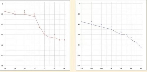 曾有位退休老人,網購了某大牌高端助聽器,卻始終覺得聲音時大時小,“發悶”、不清楚。經檢測發現,他的低頻聽力損失僅20分貝,高頻卻損失了70分貝,聽力圖曲線呈下降型。而網購機器的默認設置是均衡放大所有頻率(如統一補償50分貝)。這種“一刀切”式的補償方案易導致雙重問題產生:①對于僅20dB(正常范圍之內)的低頻部分補償過剩,甚至由于聲音響度過大長時間佩戴極容易損害低頻部分聽力;②對于損失高達70dB的高頻部分補償明顯不足,導致關鍵的高頻語音信息(如輔音)被掩蓋,出現聽不清的情況。